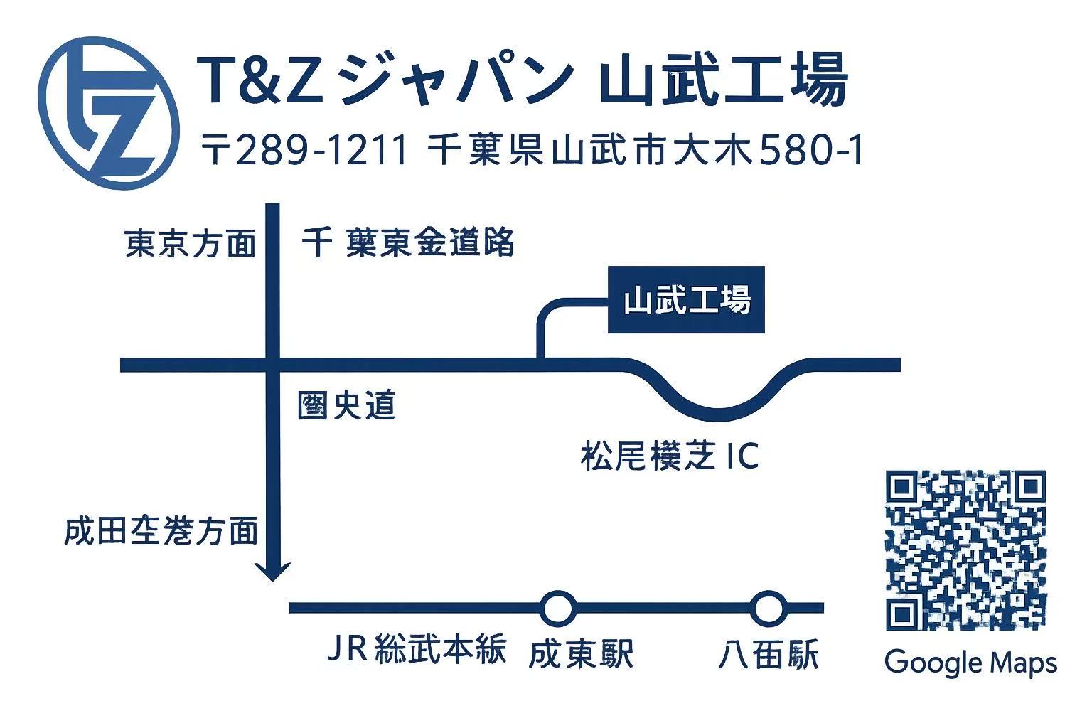 株式会社 T&Z ジャパン 千葉工場: 〒289-1211 千葉県山武市大木580-1 ☎ 043-309-7291 📠 043-309-7292 アクセス(GoogleMap表記) 「電車」の場合 JR総武本線八街駅(南口)より2.5kmタクシーで約5分,徒歩で約30分 「お車」の場合 高速東関東自動車道-[佐倉IC],[酒々井IC]より15km車で約25分 首都圏中央連絡自動車道[山武成東IC]より5km車で約10分